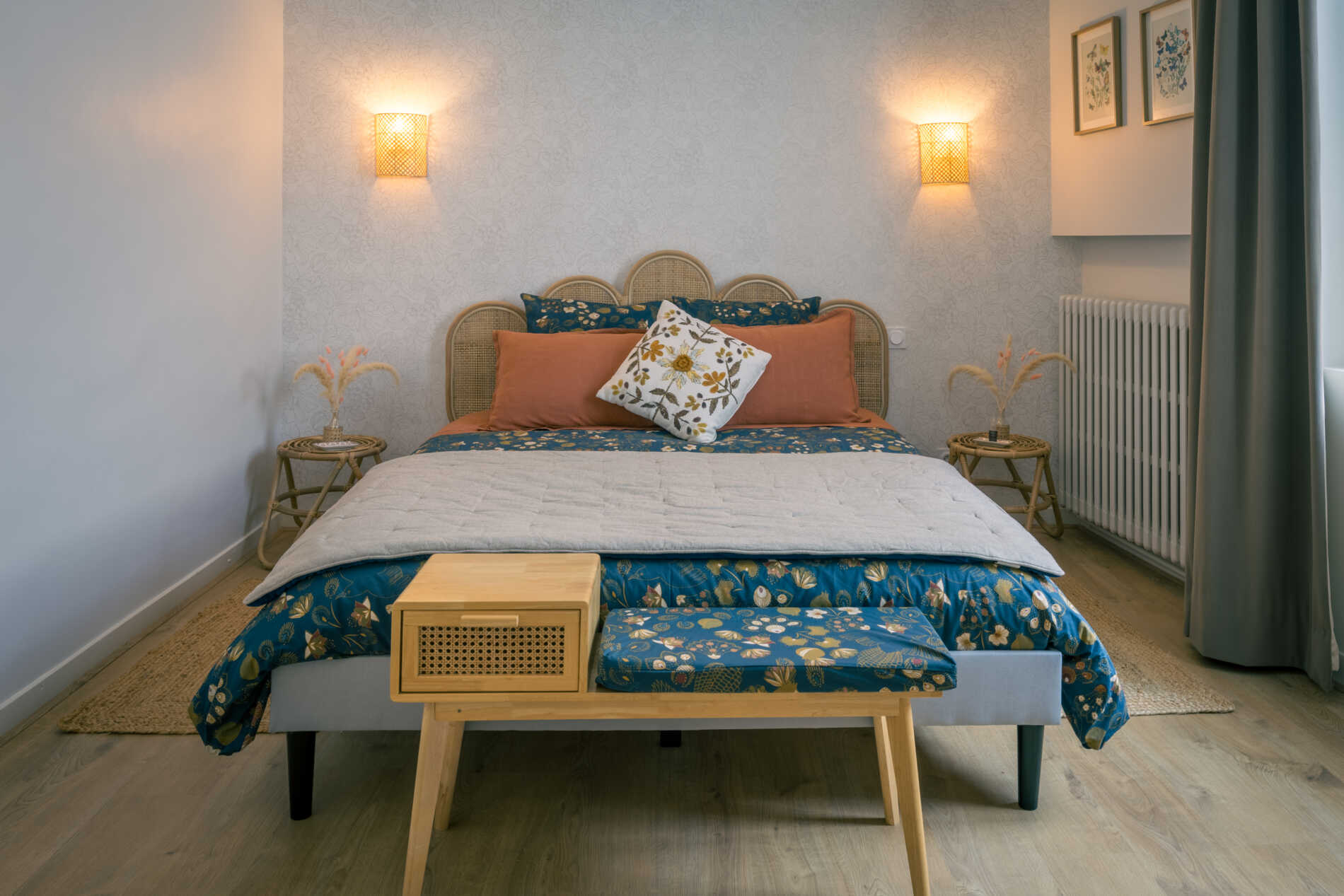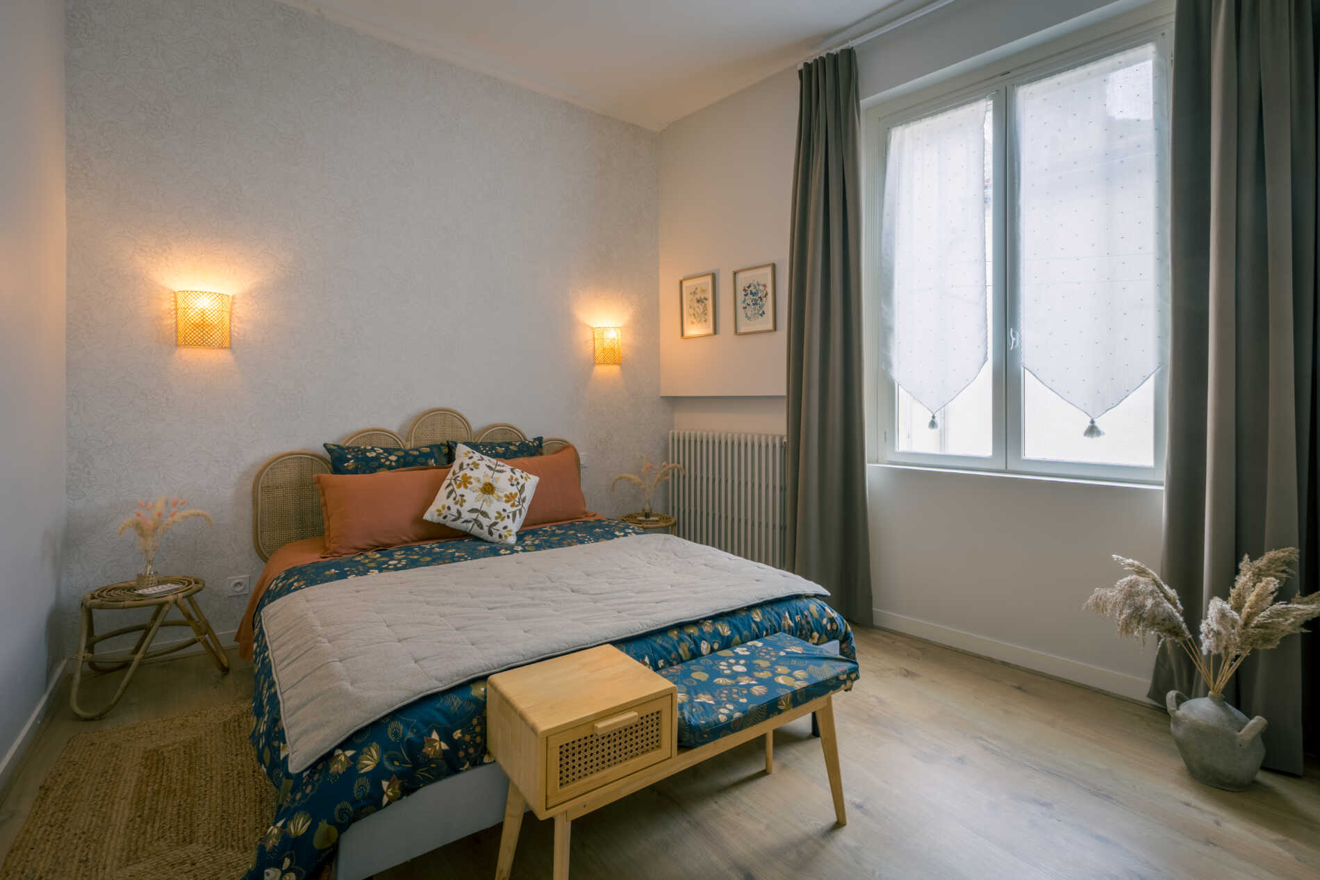 Située au 2ème étage, cette chambre offre une vue imprenable sur le jardin, permettant de profiter d’une atmosphère paisible et verdoyante depuis un espace lumineux et intime.